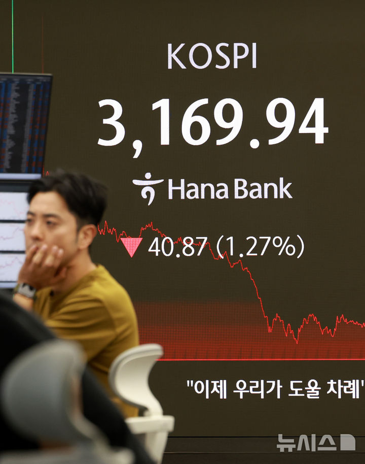 [서울=뉴시스] 이영환 기자 = 코스피가 22일 전 거래일 보다 40.87포인트(1.27%) 내린 3169.94에 장을 마감한 22일 오후 서울 중구 하나은행 딜링룸 전광판에 지수가 표시되어 있다.