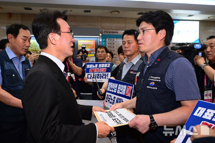 [서울=뉴시스] 청사사진기자단 = 김민석(왼쪽) 국무총리가 22일 오후 서울 영등포 한국노총을 방문해 한전KPS노조로부터 발전산업 협의체 참여보장 요구서를 건네받고 있다. 2025.07.23. [email protected]