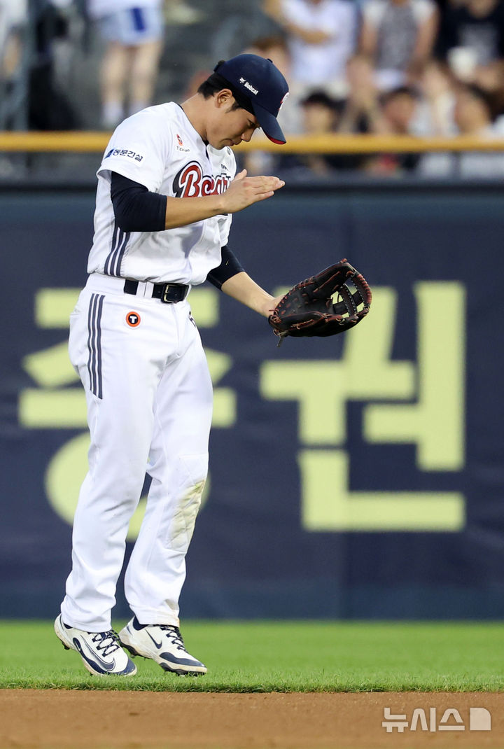 [서울=뉴시스] 홍효식 기자 = 22일 서울 송파구 잠실야구장에서 열린 2025 KBO리그 한화 이글스와 두산 베어스의 경기, 5회초 2사 1,2루 2루수 오명진이 한화 리베라토의 타구를 잡아 송구아웃 시킨 뒤 환호하고 있다. 2025.07.22. [email protected]