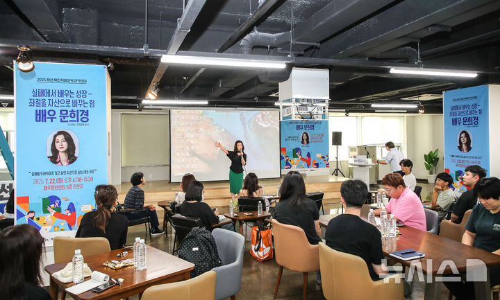 [제주=뉴시스] 우장호 기자 = 배우 문희경씨가 22일 오후 제주시 제주청년센터 5층 라운지에서 열린 '2025 청년 체인지메이커 아카데미'에서 '실패에서 배우는 성장-좌절을 자산으로 바꾸는 힘'을 주제로 강연하고 있다.