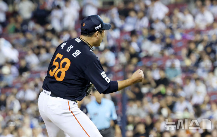 [서울=뉴시스] 홍효식 기자 = 22일 서울 송파구 잠실야구장에서 열린 2025 KBO리그 한화 이글스와 두산 베어스의 경기, 7회말 등판한 한화 바뀐 투수 박상원이 무실점으로 수비를 마친 뒤 환호하고 있다. 2025.07.22. [email protected]