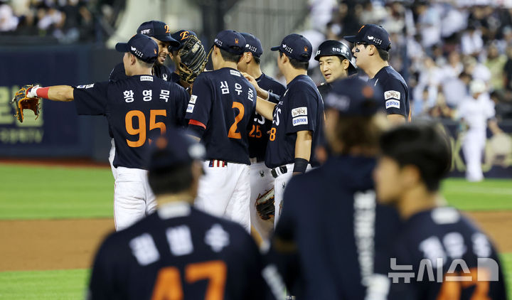 [서울=뉴시스] 홍효식 기자 = 22일 서울 송파구 잠실야구장에서 열린 2025 KBO리그 한화 이글스와 두산 베어스의 경기, 2-1로 승리한 한화 선수들이 기뻐하고 있다.