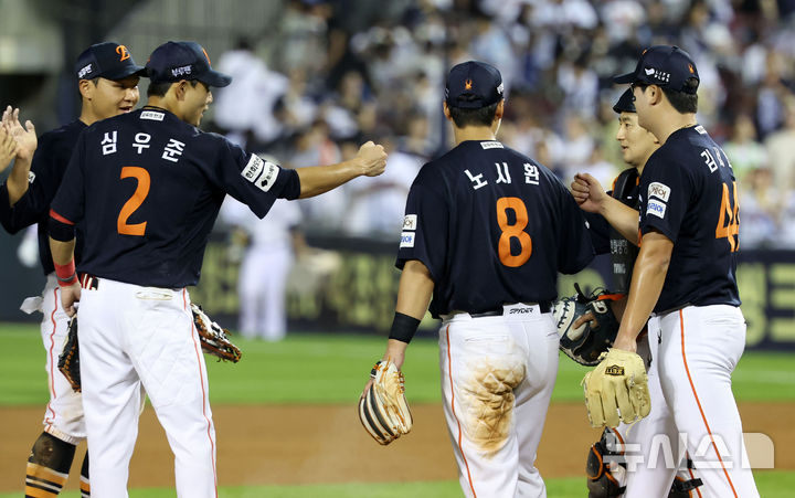[서울=뉴시스] 홍효식 기자 = 22일 서울 송파구 잠실야구장에서 열린 2025 KBO리그 한화 이글스와 두산 베어스의 경기, 2-1로 승리한 한화 선수들이 기뻐하고 있다.