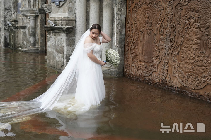 [말롤로스=AP/뉴시스] 22일(현지 시간) 필리핀 불라칸주 말롤로스의 침수된 바라소아인 성당에서 신랑 베르디요와 결혼하는 신부 하마이카가 물 속에서 신부 입장을 준비하고 있다. 이 성당은 제6호 태풍 '위파'의 영향으로 침수돼 있었으나 신랑·신부는 결혼식을 강행했으며 하객들은 맨발에 바지를 걷어 올린 채 이들을 축하했다. 2025.07.23.
