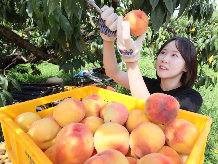 [임실=뉴시스] 김종효 기자 = 최고 품질의 임실 과수 특산물 '임실N복숭아'의 홍보차 23일 전북 임실군의 복숭아 농가를 찾은 임실군청 공무원이 복숭아 수확일을 돕고 있다. (사진=임실군 제공) 2025.07.23. [email protected]