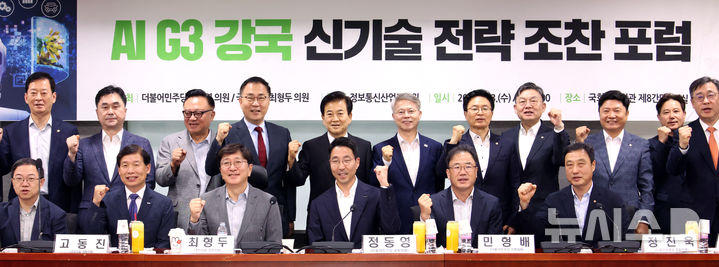 [서울=뉴시스] 김금보 기자 = 정동영 통일부 장관후보자와 최형두 국민의힘 의원 등 참석자들이 23일 서울 여의도 국회 의원회관에서 열린 'AI G3 강국 신기술 전략 조찬 포럼'에서 기념촬영을 하고 있다. 2025.07.23. [email protected]