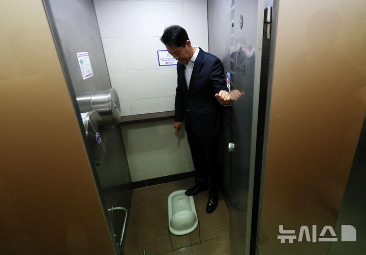 [서울=뉴시스] 배훈식 기자 = 지하철 공간혁신 현장방문에 나선 오세훈 서울시장이 23일 오전 서울 송파구 잠실역 화장실을 점검하고 있다. 서울시는 지하철 역사 내 화장실 구형 화변기 교체 등을 통해 시민 불편을 해소할 계획이다. 2025.07.23. [email protected]
