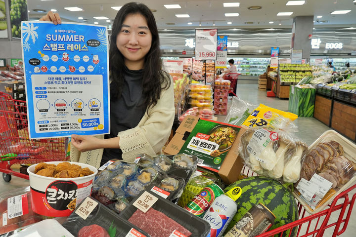[서울=뉴시스] 롯데마트는 오는 24일부터 30일까지 '7말8초' 나들이족을 위한 '떠나요 맛캉스' 할인 행사를 진행한다고 23일 밝혔다. 사진은 지난 22일 서울 중구 롯데마트 제타플렉스 서울역점 신선 코너에서 직원이 할인 상품을 홍보하고 있다. (사진=롯데마트 제공) 2025.07.23. [email protected] *재판매 및 DB 금지