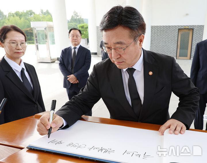 [서울=뉴시스] 이영환 기자 = 윤호중 행정안전부 장관이 23일 오전 서울 동작구 국립서울현충원 현충탑 참배를 마친 후 방명록을 작성하고 있다. 2025.07.23. [email protected]