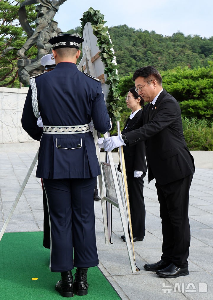 [서울=뉴시스] 이영환 기자 = 윤호중 행정안전부 장관이 23일 오전 서울 동작구 국립서울현충원 현충탑 참배를 하며 헌화를 하고 있다. 2025.07.23. [email protected]