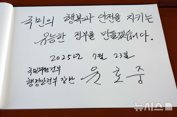 윤 장관은 방명록에 국민의 행복과 안전을 지키는 유능한 정부를 만들겠습니다 라는 메시지를 적었다. 2025.07.23. [email protected]