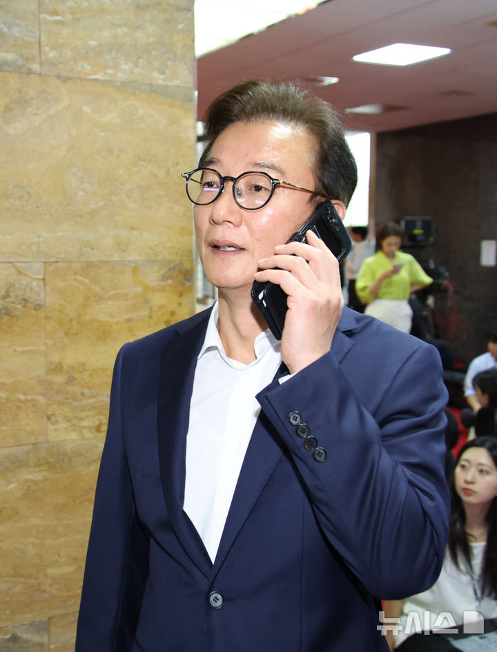 [서울=뉴시스] 김금보 기자 = 전재수 해양수산부 장관 후보자가 23일 서울 여의도 국회에서 열린 더불어민주당 의원총회에 출석하고 있다. 2025.07.23. [email protected]