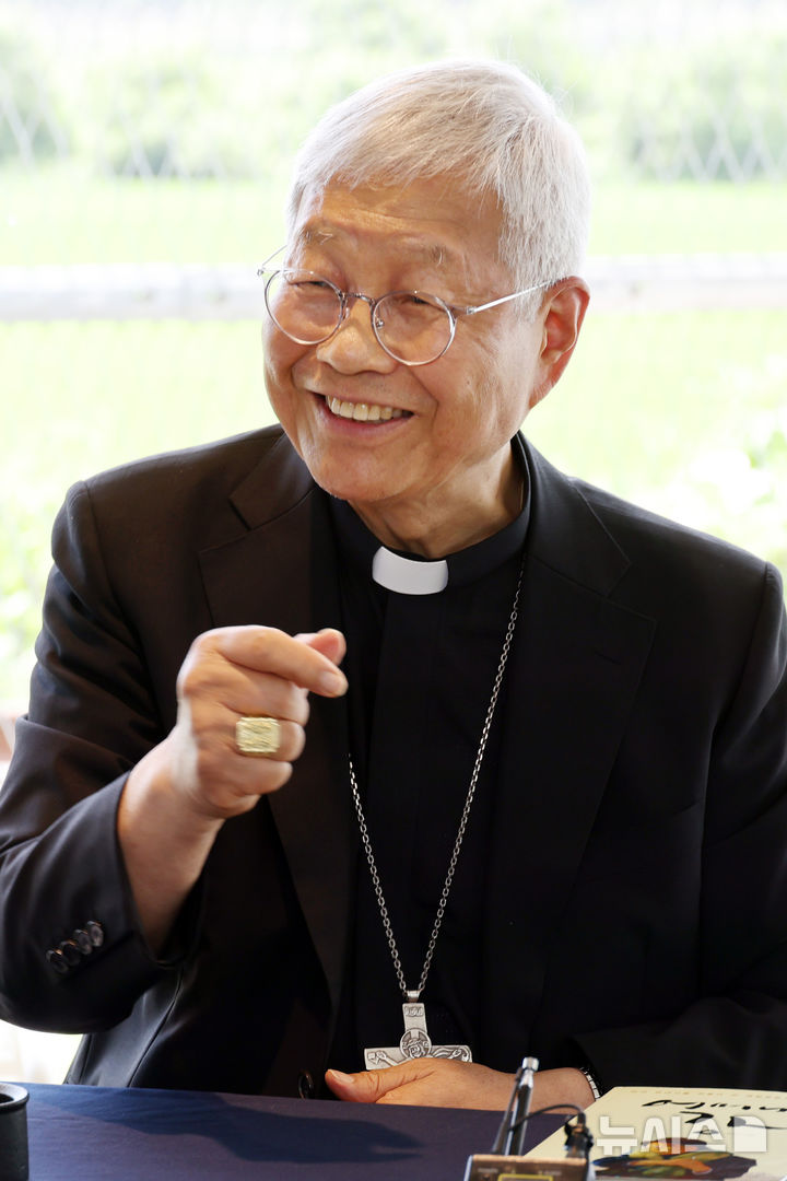 [파주=뉴시스] 국회사진기자단= 유흥식 추기경이 23일 경기도 파주 임진각 평화누리공원에서 우원식 국회의장을 만나 발언을 하고 있다. 2025.07.23. [email protected]