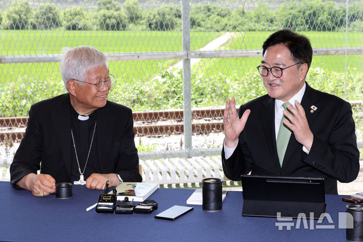 [파주=뉴시스] 국회사진기자단= 유흥식 추기경과 우원식 국회의장이 23일 경기도 파주 임진각 평화누리공원 한 카페에서 대담을 하고 있다. 2025.07.23. [email protected]