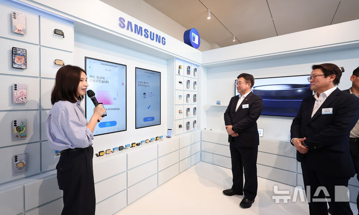 [서울=뉴시스] 김진아 기자 = 윤호중(가운데) 행정안전부 장관이 23일 서울 성동구 앤더슨씨 신관에서 열린 모바일 신분증 25년 민간개방 오픈 행사에서 삼성전자 부스를 방문해 모바일 신분증 혁신 서비스 시연을 하고 있다. 오른쪽은 박승희 삼성전자 사장. (공동취재) 2025.07.23. [email protected]