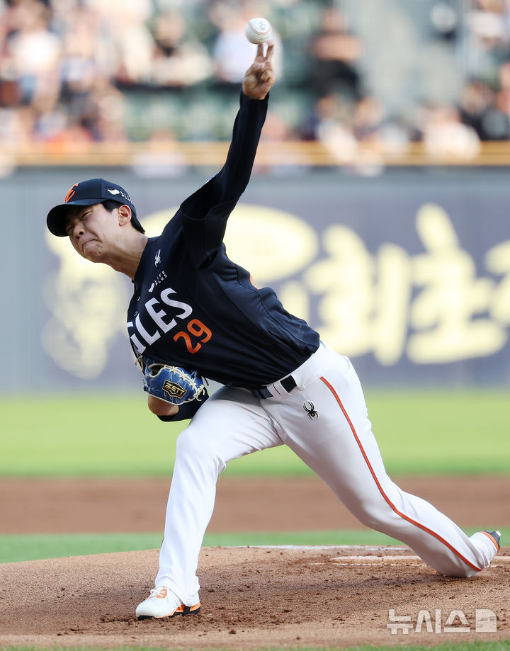 [서울=뉴시스] 조성우 기자 = 23일 서울 송파구 잠실야구장에서 열린 2025 KBO리그 한화 이글스와 두산 베어스의 경기, 한화 선발투수 황준서가 역투하고 있다. 2025.07.23. [email protected]