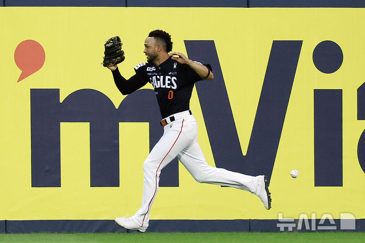 [서울=뉴시스] 조성우 기자 = 23일 서울 송파구 잠실야구장에서 열린 2025 KBO리그 한화 이글스와 두산 베어스의 경기, 두산 4회말 공격 1사 후 한화 중견수 리베라토가 박준순의 타구를 놓치고 있다. 2025.07.23. [email protected]