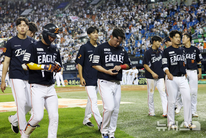 [서울=뉴시스] 조성우 기자 = 23일 서울 송파구 잠실야구장에서 열린 2025 KBO리그 한화 이글스와 두산 베어스의 경기, 2-13으로 두산에 패한 한화 선수들이 굳은 표정으로 그라운드를 나서고 있다. 2025.07.23. [email protected]