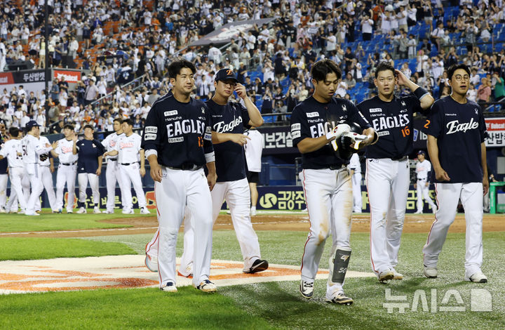[서울=뉴시스] 조성우 기자 = 23일 서울 송파구 잠실야구장에서 열린 2025 KBO리그 한화 이글스와 두산 베어스의 경기, 2-13으로 두산에 패한 한화 선수들이 굳은 표정으로 그라운드를 나서고 있다. 2025.07.23. [email protected]