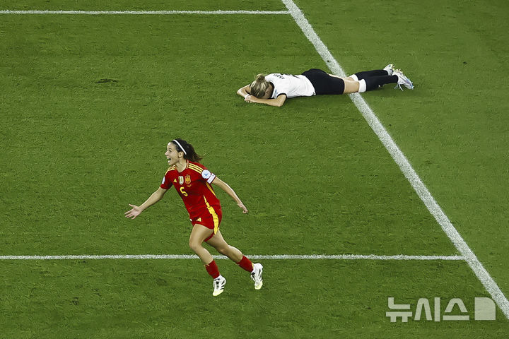 [취리히=AP/뉴시스] 스페인의 아이타나 본마티가 23일(현지 시간) 스위스 취리히의 레치그룬트 슈타디온에서 열린 2025 유럽축구연맹(UEFA) 유럽 여자축구 선수권(여자 유로) 준결승 독일과의 경기 연장 후반 7분 결승 골을 넣은 후 환호하고 있다. 스페인이 1-0으로 승리하고 결승에 올라 지난 우승 팀인 잉글랜드와 패권을 다툰다. 2025.07.24.