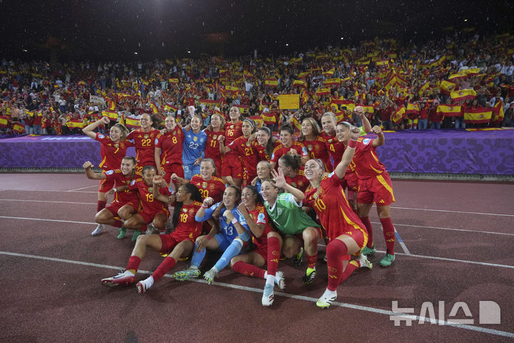 [취리히=AP/뉴시스] 스페인 선수들이 23일(현지 시간) 스위스 취리히의 레치그룬트 슈타디온에서 열린 2025 유럽축구연맹(UEFA) 유럽 여자축구 선수권(여자 유로) 준결승에서 독일을 물리친 후 팬들과 기념 촬영하고 있다. 스페인은 연장 후반 7분 아이타나 본마티의 결승 골로 독일을 1-0으로 꺾고 결승에 올라 지난 우승 팀인 잉글랜드와 패권을 다툰다. 2025.07.24.