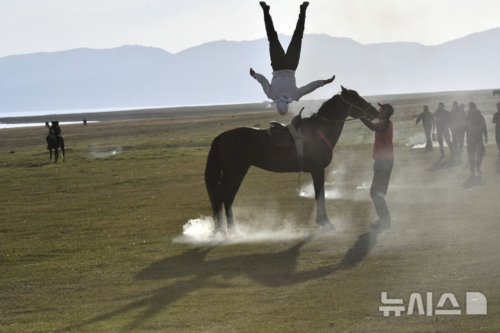 [송쿨=AP/뉴시스] 지난 21일(현지 시간) 키르기스스탄 비슈케크 남동쪽 약 280㎞ 떨어진 송쿨호 인근에서 열린 ‘더 갤롭스 2025’ 참가자가 곡예 승마를 하고 있다. 2019년 인도에서 처음 열린 이 대회는 12개국 참가자 약 100명이 5일간 200㎞가 넘는 코스를 완주하는 경주로, 파리-다카르 자동차 랠리에서 영감을 받았다. 참가자들은 몽골의 게르와 유사한 키르기스 유르트에서 야영하며 승마 궁술, 코크 보루 같은 현지 문화도 체험할 수 있다. 2025.07.24.