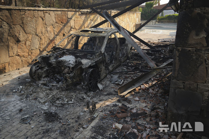 [수니=AP/뉴시스] 24일(현지 시간) 키프로스 트루도스산 남쪽에서 산불이 발생해 피해를 입은 수니 마을에 자동차 한 대가 불에 타 재로 남아 있다. 현지 당국은 이 산불로 2명이 숨진 채 발견됐으며 최소 10명이 부상했다고 밝혔다. 2025.07.24.
