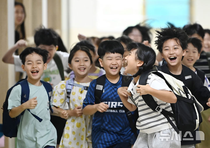 [수원=뉴시스] 김종택 기자 = 24일 경기 수원시 매산초등학교에서 3학년2반 학생들이 여름방학식을 마친 뒤 환하게 웃으며 하교하고 있다. 2025.07.24. [email protected]