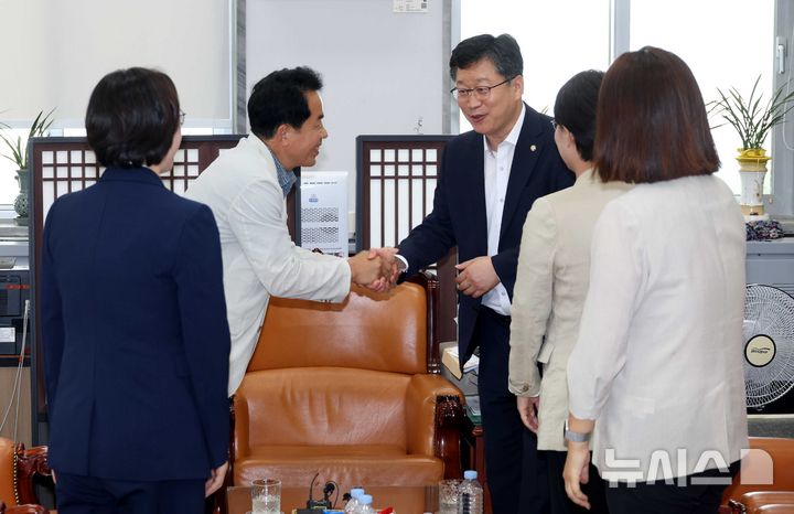 [서울=뉴시스] 조성봉 기자= 윤종오 진보당 원내대표와 의원들이 24일 오후 서울 여의도 국회 환경노동위원장실에서 안호영 국회 환경노동위원회 위원장과 면담을 하기 전 인사를 하고 있다. 이날 진보당 의원들은 안 위원장에게 '후퇴없는 노조법 2·3조 즉각 개정'을 촉구했다. 2025.07.24. [email protected]