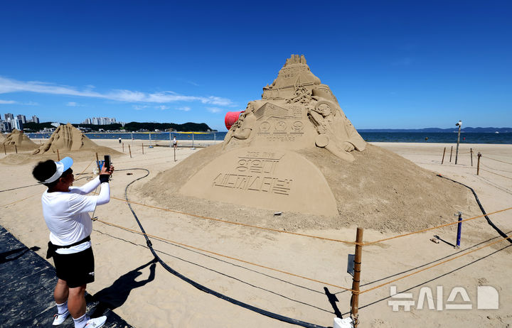 [포항=뉴시스] 이무열 기자 = 제9회 영일대 샌드페스티벌 개막을 이틀 앞둔 24일 경북 포항시 북구 영일대해수욕장을 찾은 관광객이 다양한 모래조각 작품을 관람하고 있다. 2025.07.24. [email protected]