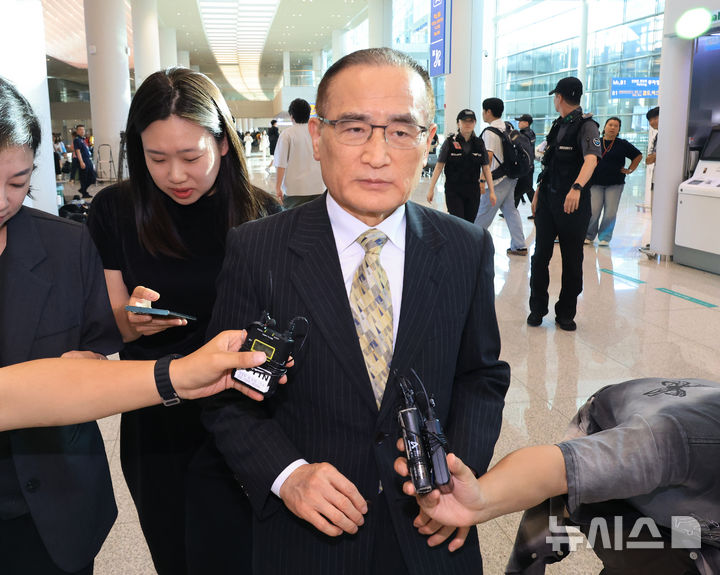 [인천공항=뉴시스] 황준선 기자 = 관세 협상 등 한미 양국 간 현안 논의를 위해 미국을 방문한 위성락 국가안보실장이 24일 오후 인천국제공항 제2터미널을 통해 귀국하고 있다. (공동취재) 2025.07.24. [email protected]