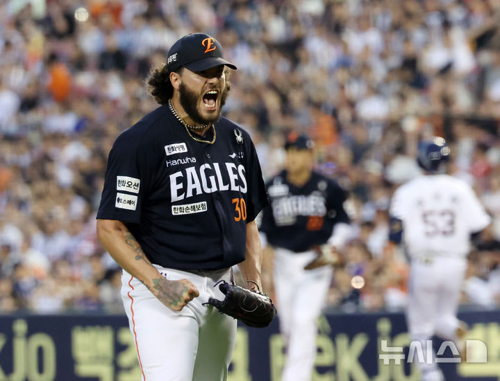 [서울=뉴시스] 배훈식 기자 = 24일 오후 서울 송파구 잠실야구장에서 열린 2025 신한 쏠뱅크 KBO리그 두산 베어스와 한화 이글스의 경기, 5회말 2사 3루 위기를 무실점으로 넘긴 한화 선발 폰세가 포효하고 있다. 2025.07.24. [email protected]
