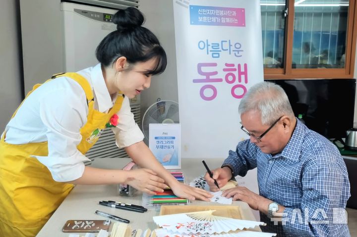 [제천=뉴시스] 이병찬 기자 = 신천지자원봉사단 충북 제천지부가 25일 제천 보훈회관에서 보훈회원들을 상대로 부채만들기 체험 행사를 하고 있다.(사진=신천지 제공)[email protected]