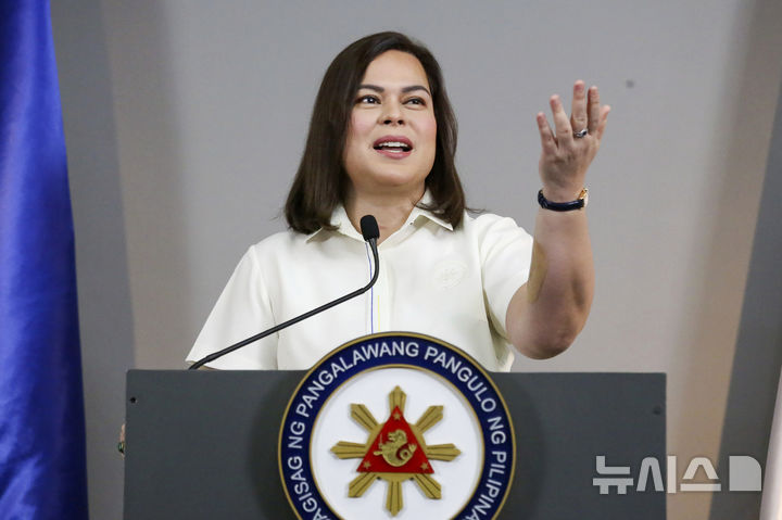 [마닐라(필리핀)=AP/뉴시스]사라 두테르테 필리핀 부통령이 2월7일 마닐라에서 기자회견 중 제스처를 취하고 있다. 필리핀 대법원은 25일 두테르테 부통령에 대한 탄핵이 절차상의 문제로 헌법을 위반했다고 판결했다. 이에 따라 대통령 암살 위협을 포함한 일련의 범죄 혐의에 대한 그녀의 예정된 재판이 연기되게 됐다. 2025.07.25.