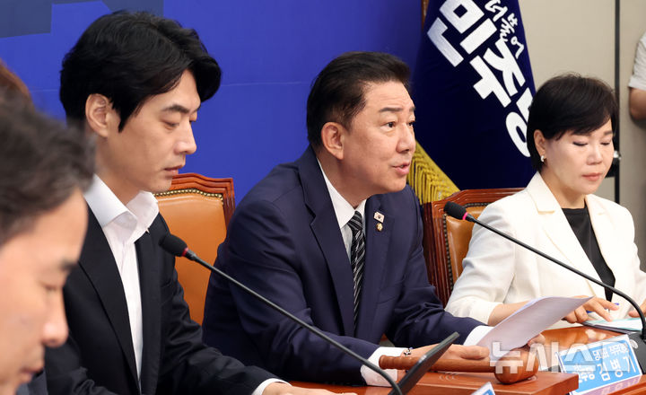 [서울=뉴시스] 김금보 기자 = 김병기 더불어민주당 당대표 직무대행 겸 원내대표가 25일 서울 여의도 국회에서 열린 최고위원회의에서 발언을 하고 있다. 2025.07.25. [email protected]