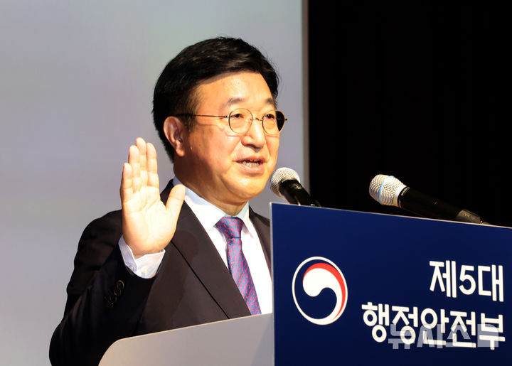 [세종=뉴시스] 강종민 기자 = 윤호중 행정안전부 장관이 25일 세종시 정부세종청사에서 열린 취임식에서 취임선서를 하고 있다. 2025.07.25. [email protected]