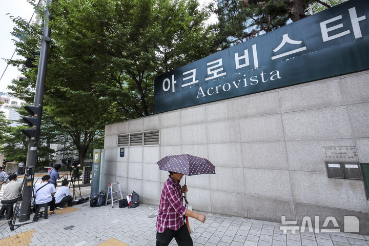 [서울=뉴시스] 조성우 기자 = 김건희 여사의 각종 의혹을 수사 중인 특별검사팀이 윤석열 전 대통령 부부의 자택에 대해 압수수색에 착수한 25일 서울 서초구 아크로비스타 앞에서 취재진이 대기하고 있다. 2025.07.25. [email protected]