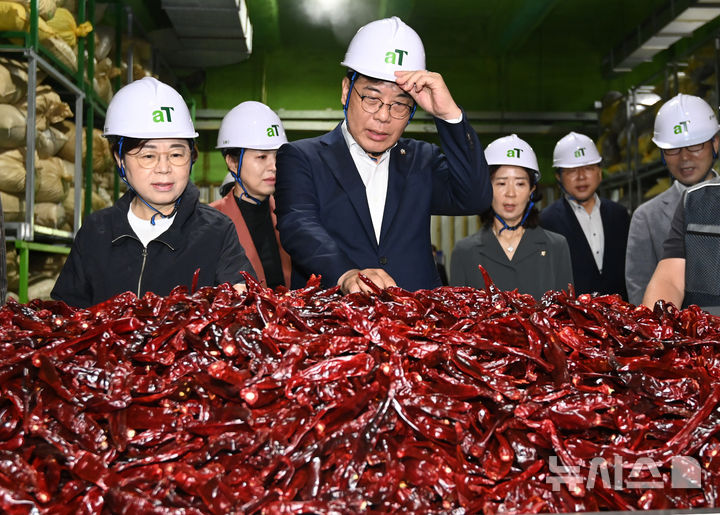 [이천=뉴시스] 김종택 기자 = 송언석 국민의힘 비상대책위원장 겸 원내대표가 25일 경기 이천시 aT 한국농수산식품유통공사 이천비축기지를 찾아 폭우·폭염으로 인한 농산물 물가 상황을 점검하고 있다. 2025.07.25. [email protected]