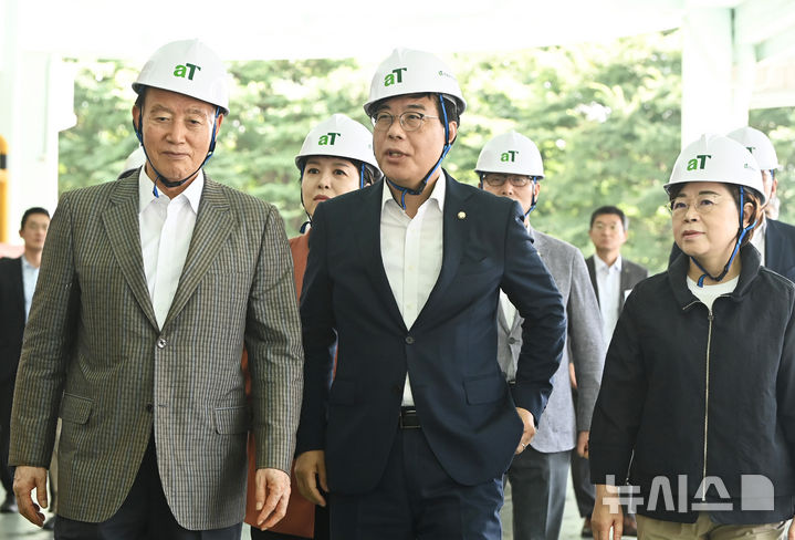 [이천=뉴시스] 김종택 기자 = 송언석 국민의힘 비상대책위원장 겸 원내대표가 25일 경기 이천시 aT 한국농수산식품유통공사 이천비축기지를 찾아 폭우·폭염으로 인한 농산물 물가 상황을 점검하고 있다. 2025.07.25. [email protected]