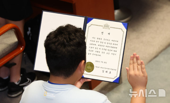 [서울=뉴시스] 김금보 기자 = 25일 서울 여의도 국회에서 열린 제21회 대한민국 어린이국회 본회의에서 학생들이 선서를 하고 있다. 2025.07.25. [email protected]