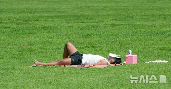 [전주=뉴시스] 김얼 기자 = 전북 최고기온이 영상 37도를 기록하며 곳곳에 폭염경보가 발효된 25일 전북 전주시 덕진구 세병공원을 찾은 한 시민이 뜨거운 햇살 아래에서 선탠을 즐기고 있다. 2025.07.25. [email protected]