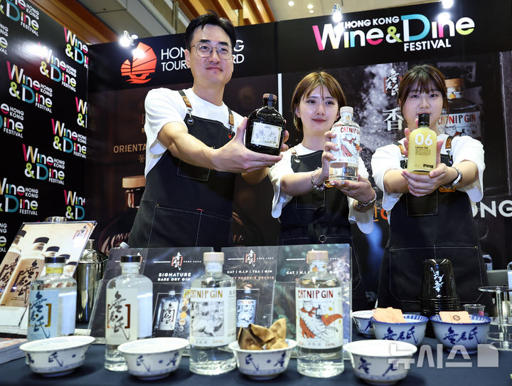 [서울=뉴시스] 최진석 기자 = 25일 서울 강남구 코엑스에서 열린 '2025 서울바앤스피릿쇼'에서 홍콩관광청 부스 관계자들이 홍콩을 대표하는 로컬 주류 브랜드 상품을 소개하고 있다. 2025.07.25. [email protected]