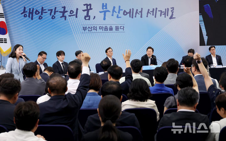 [부산=뉴시스] 최동준 기자 = 이재명 대통령이 25일 부산 부경대에서 열린 타운홀미팅 '부산의 마음을 듣다' 지역 주민 간담회에서 질문을 받고 있다. (대통령실통신사진기자단) 2025.07.25. [email protected]