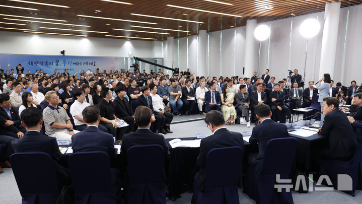 [부산=뉴시스] 최동준 기자 = 이재명 대통령이 25일 부산 부경대에서 열린 타운홀미팅 '부산의 마음을 듣다' 지역 주민 간담회에서 질문을 받고 있다. (대통령실통신사진기자단) 2025.07.25. [email protected]