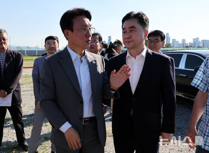 [세종=뉴시스] 강종민 기자 = 김민석 국무총리가 25일 오후 세종시 국회 세종의사당 예정부지를 방문, 김종민 국회의원과 대화하고 있다. 2025.07.25. [email protected]