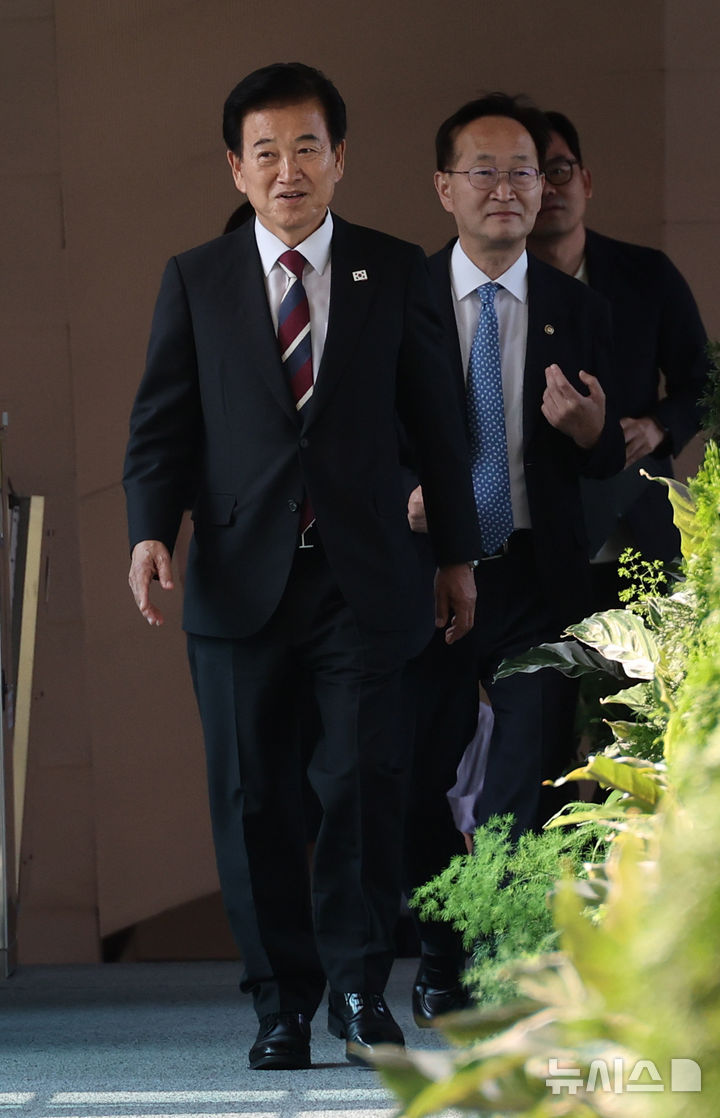 [서울=뉴시스] 김명원 기자 = 정동영 통일부 장관이 25일 서울 종로구 정부서울청사 별관에서 열린 제44대 통일부 장관 취임식에 참석하기 위해 이동하고 있다. 2025.07.25. [email protected]