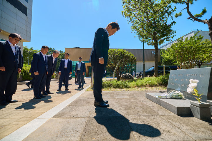 [서울=뉴시스] 최동준 기자 = 이재명 대통령이 25일 부산 부경대학교 이동진 대위 추모비를 방문해 묵념하고 있다. (사진=대통령실 제공) 2025.07.25. [email protected] *재판매 및 DB 금지