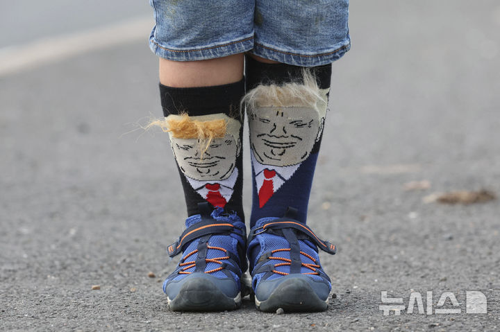 [턴베리=AP/뉴시스] 25일(현지 시간) 스코틀랜드 턴베리 골프장에서 도널드 트럼프 미국 대통령 얼굴이 디자인된 양말을 신은 소년이 트럼프가 도착하기를 기다리고 있다. 트럼프 대통령은 닷새 일정으로 어머니의 고향인 스코틀랜드를 비공식 방문해 본인 소유인 턴베리 골프 리조트와 애버딘 골프 리조트를 방문할 것으로 알려졌다. 2025.07.26.