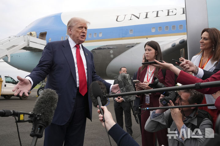 [에어셔=AP/뉴시스] 도널드 트럼프 미국 대통령이 25일(현지 시간) 스코틀랜드 에어셔의 프레스트윅 공항에 도착해 취재진에 발언하고 있다. 트럼프 대통령은 닷새 일정으로 어머니의 고향인 스코틀랜드를 방문해 본인 소유인 턴베리 골프 리조트와 애버딘 골프 리조트를 방문할 것으로 알려졌다. 2025.07.26.