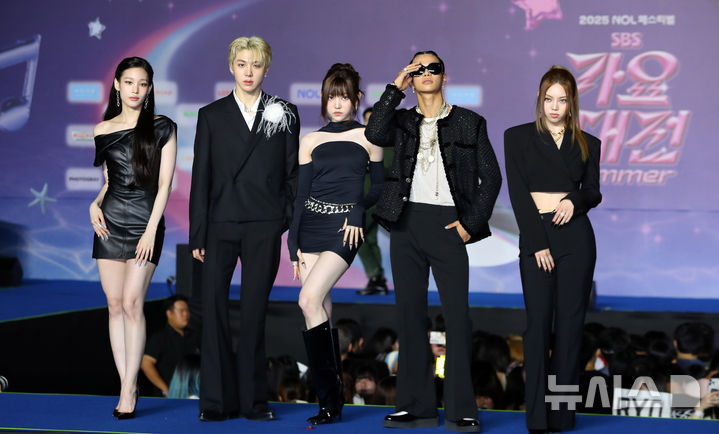[고양=뉴시스] 김혜진 기자 = 그룹 올데이 프로젝트가 26일 오후 경기 고양 일산서구 킨텍스에서 열린 2025 SBS 가요대전 써머(Summer) 블루카펫에서 포즈를 취하고 있다.
